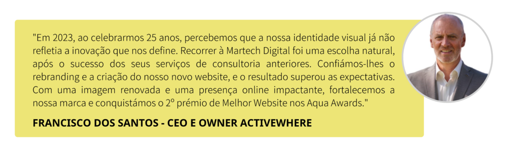 A parceria entre a Activewhere e a Martech Digital foi mais uma vez decisiva e resultou numa transformação digital do marketing e comunicação, com impacto imediato na empresa. Como prova do sucesso desta colaboração, a Activewhere venceu o 2º prémio de Melhor Website nos Aqua Awards.