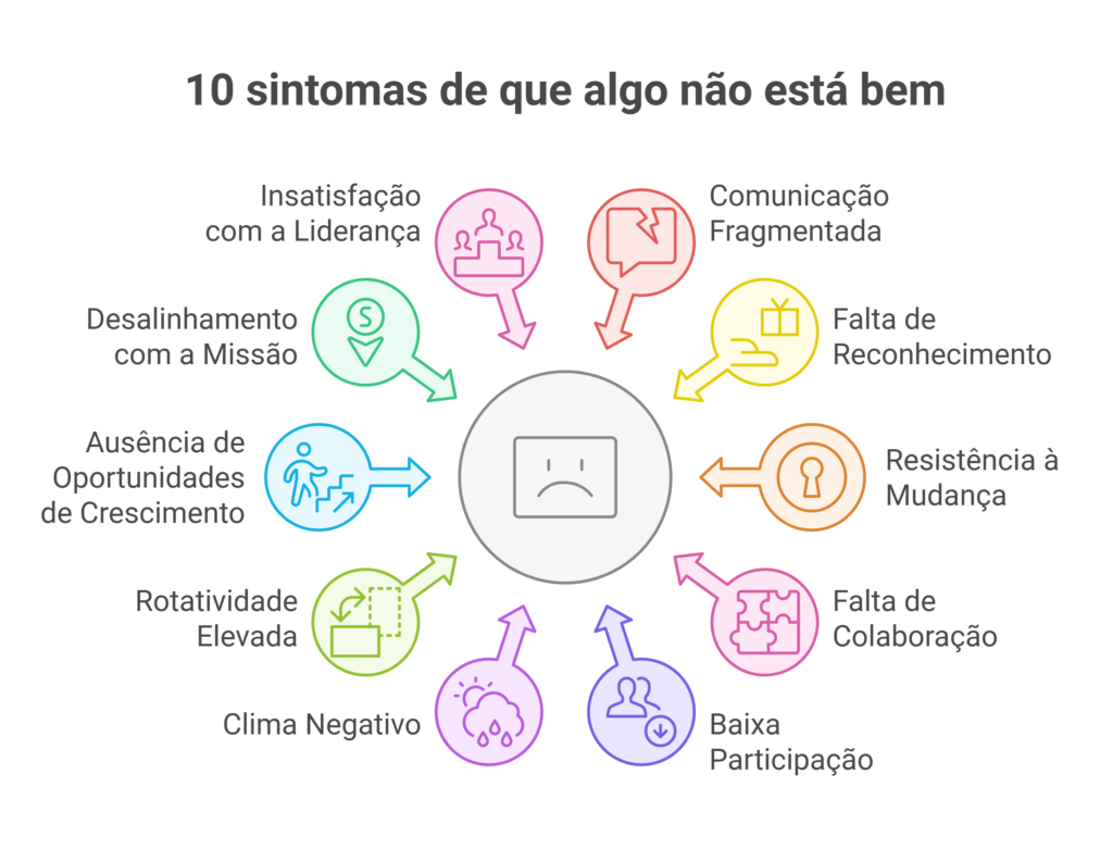 - Desalinhamento com a missão da empresa: Se os valores e a visão da organização não são claros ou vividos no dia a dia, os colaboradores perdem o propósito no trabalho.